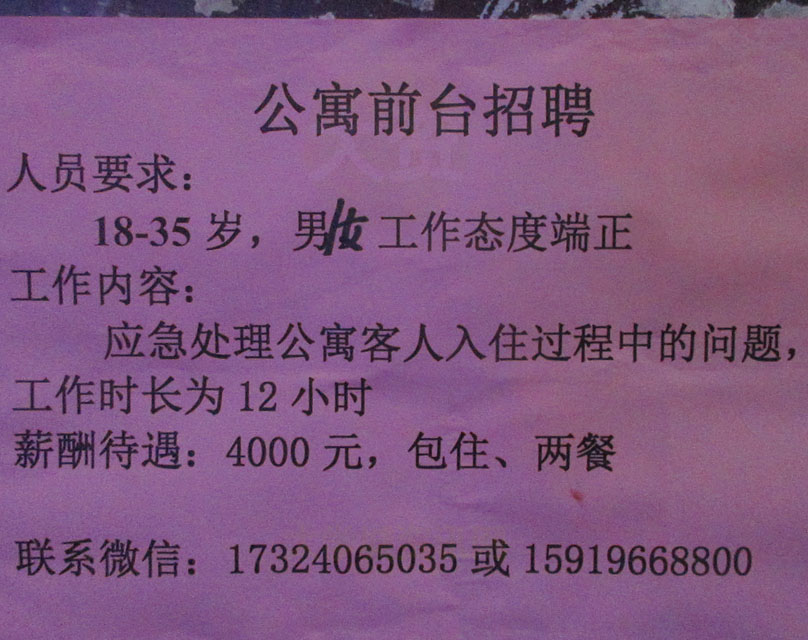 | 贝岗·公寓前台招聘 18-35岁 男女皆可 每天工作12小时 月薪4千 包吃包住 微电17324065035 | ||||||
