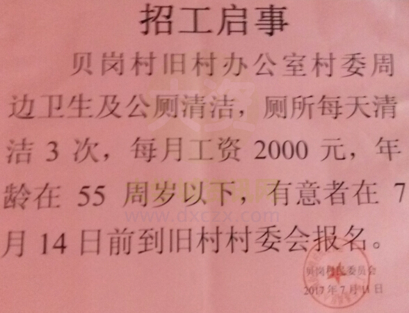 | 【招工启事】贝岗村委周边卫生清洁员 | ||||||
