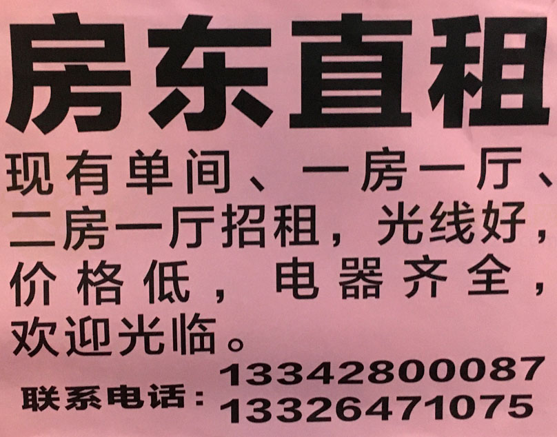 房东直租 现有单间、一房一厅、二房一厅招租,光线好,价格低,电器齐全,欢迎光临 电话13342800087 |