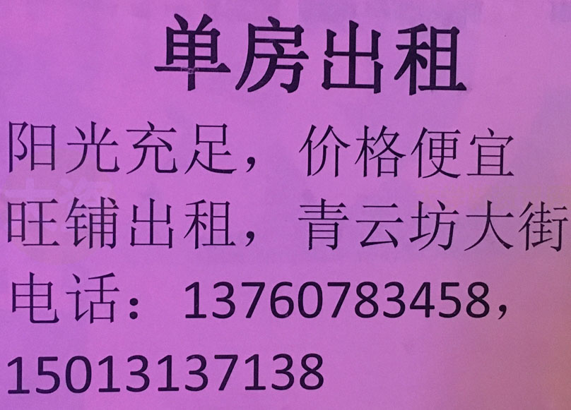 | 单间出租 阳光充足,价格便宜 旺铺出租,青云坊大街 电话:13760783458,15013137138 | ||||||