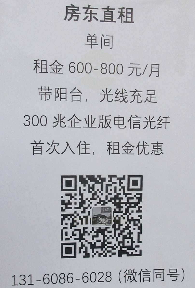 | 贝岗 房东直租 单间 租金600-800元每月 带阳台,光线充足 300兆企业版电信光纤 首次入住,租金优惠 13160866028(微信同号) | ||||||