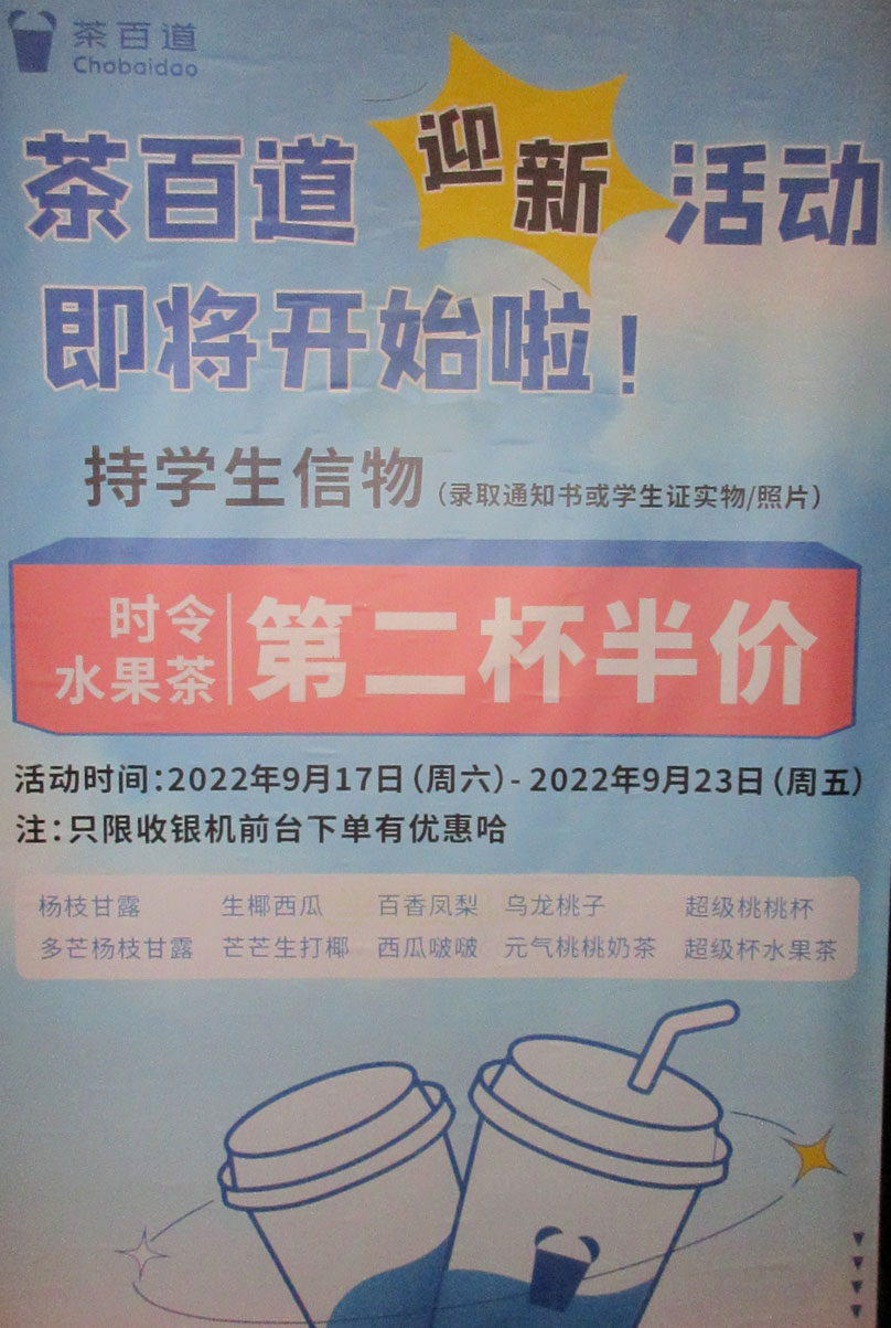 | 贝南大街中 茶百道迎新活动即将开始啦 持录取证书学生证等 时令水果茶第二杯半价 时间2022.09.17-09.23 到店购买才有优惠 | ||||||