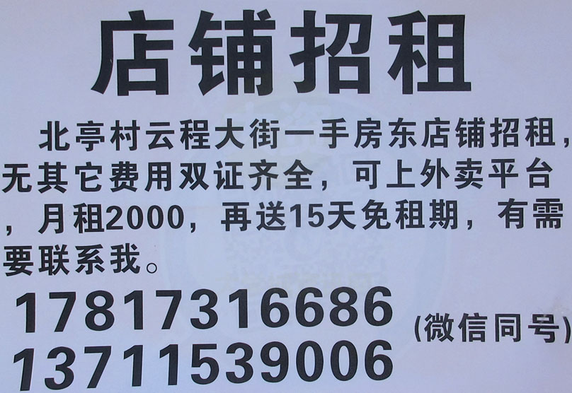 店铺招租 北亭村云程大街一手房东店铺招租,无其它费用双证齐全,可上外卖平台,月租2000,再送15天免租期,有需要联系17817316686 13711539006 |