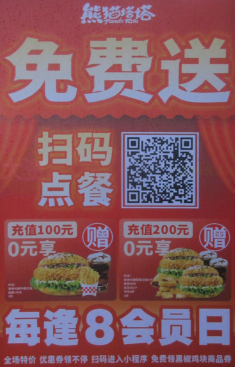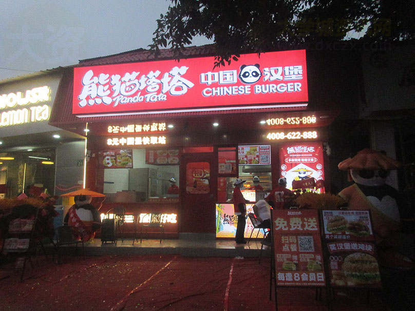 北亭临中环村口 今天新开张了一家专卖汉堡店 叫熊猫塔塔 开业期间,有充值免费送套餐活动 香辣鸡腿&板烧鸡腿2个装超值价12元 买汉堡免费送鸡块