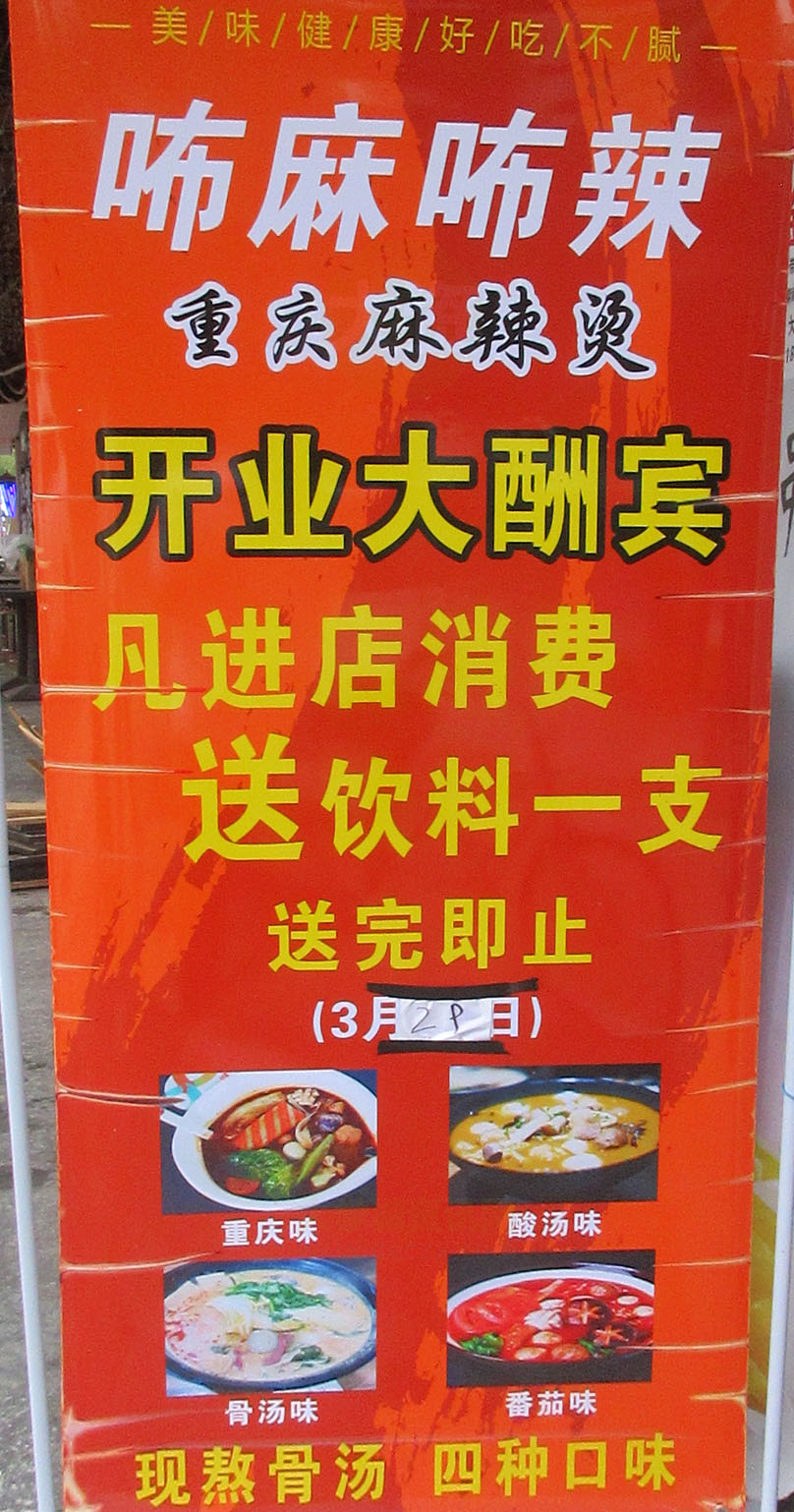 | 东门广场北拓区临大路边 最近新开一家叫咘麻咘辣的重庆麻辣烫,开业期间送饮料一瓶 | ||||||