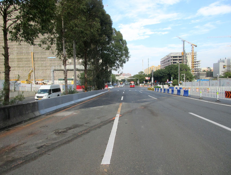 北区中环出生物岛隧道原先临时凿建的引入坡道,已经完全恢复中环道路原状,路边低矮围栏墙也是修筑一新,看着是舒服多了