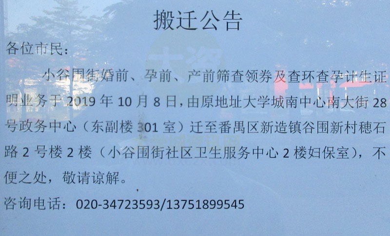 | 小谷围街婚前、孕前、产前筛查领券及查环查孕计生证明业务 将搬到对面谷围新村 | ||||||