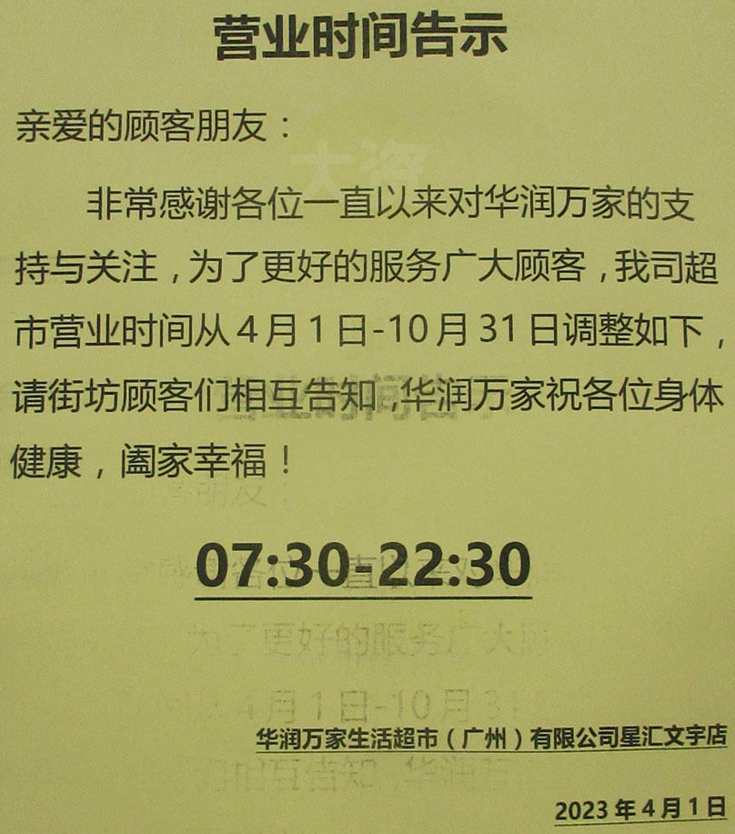 | 华润万家营业时间时段调整为夏令时 早上7点半-晚上10点半 4月1号起至10月31号期间 | ||||||