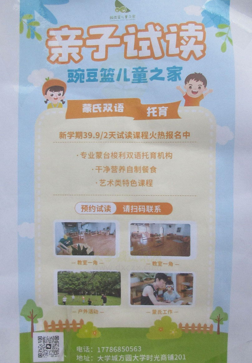 | 大学城南区 大学时光楼盘西列南 豌豆篮儿童之家 亲子试读 蒙氏双语托育 新学期39.9元2天试读课程报名中 电话17786850563 | ||||||