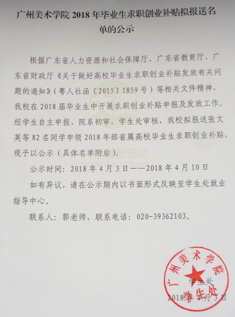 | 广州美术学院2018年毕业生求职创业补贴拟报送名单公示 | ||||||