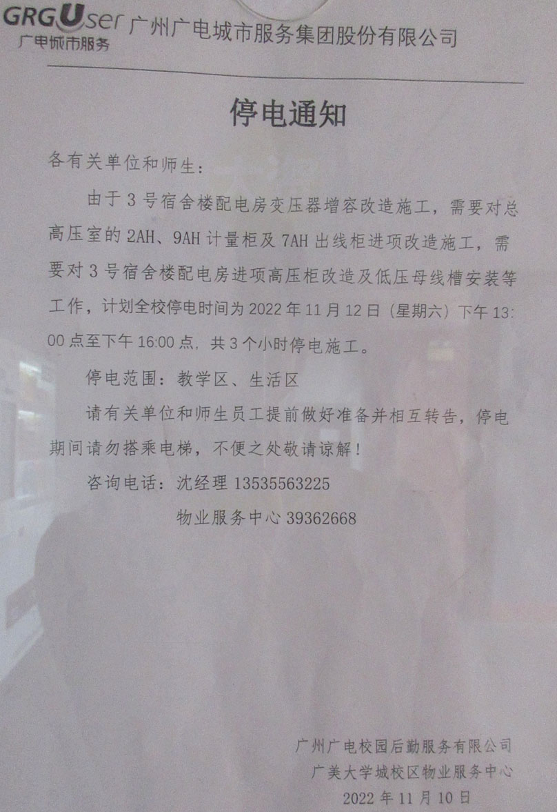 | 生活区3栋宿舍楼配电房变压器扩容改造施工,11月12日周六下午13点-16点需停电3小时 | ||||||