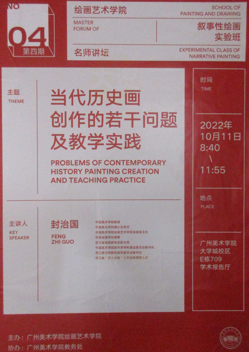 绘画学院名师讲座 主题-当代历史画创作的若干问题及教学实践 2022.10.11上午8点40-11点55 E栋709学术报告厅 主讲-封治国 |