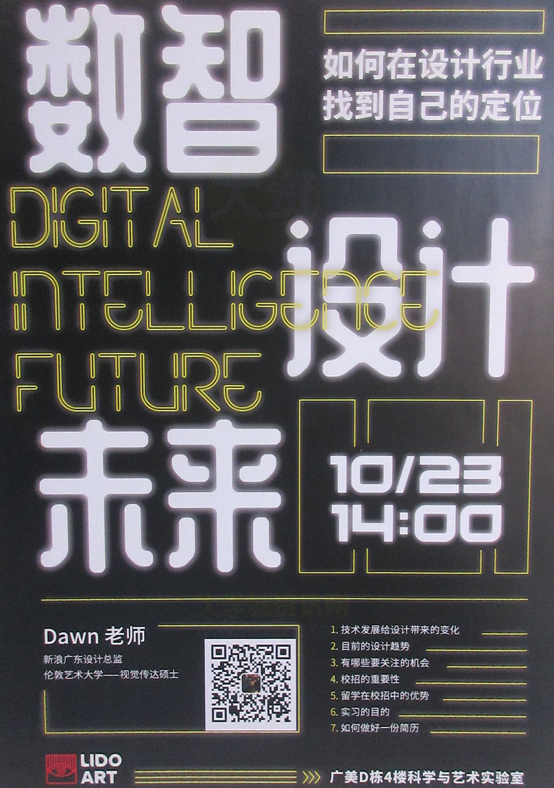 | 数智设计未来·如何在设计行业找到自己的定位 10.23周日下午14点 教学区D栋4楼科学与艺术实验室 | ||||||