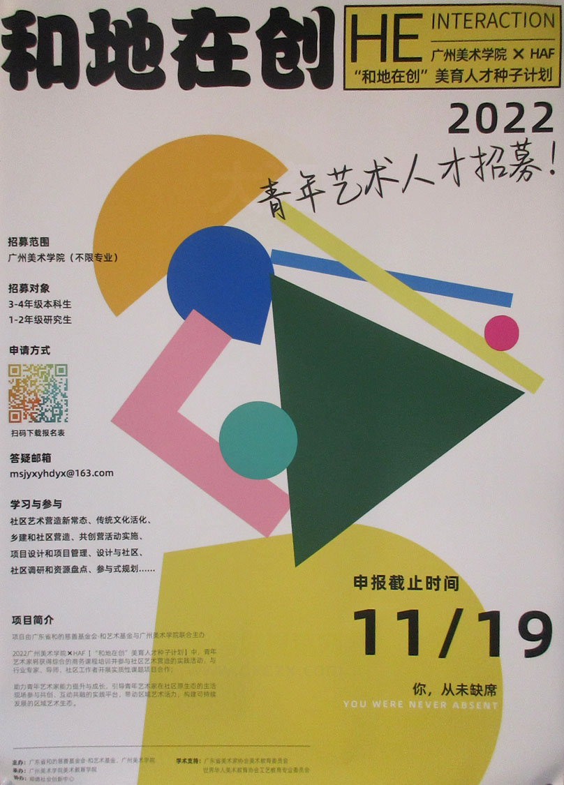 和地在创·2022青年艺术人才招募 面向广美不限专业,对象3-4年级本科生1-2年级研究生 扫码下载报名表 申报截止11.19 |