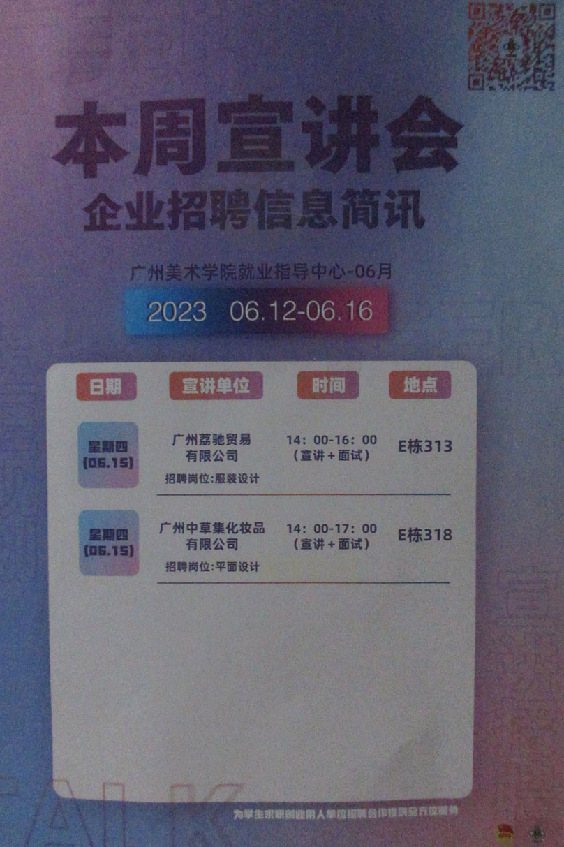| 广州荔驰贸易有限公司宣讲会 招聘岗位-服装设计 2023.06.15周四下午14点-16点 宣讲+面试 教学区E栋313 广州中草集化妆品有限公司 招聘岗位-平面设计 2023.06.15周四下午14点-17点 宣讲+面试 教学区E栋 | ||||||