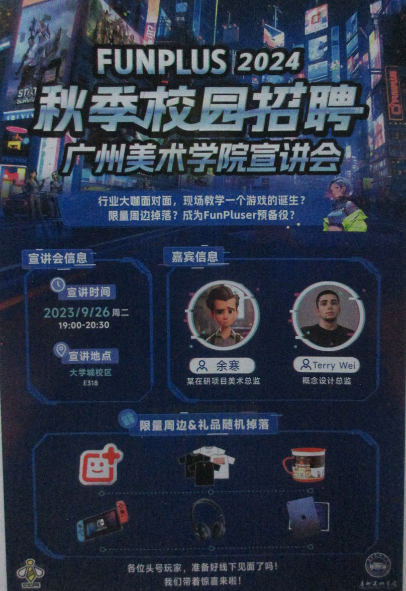 | FUNPLUS 2024秋季校园招聘 广美宣讲会 2023.09.26周二晚19点-20点30 教学区E318 | ||||||