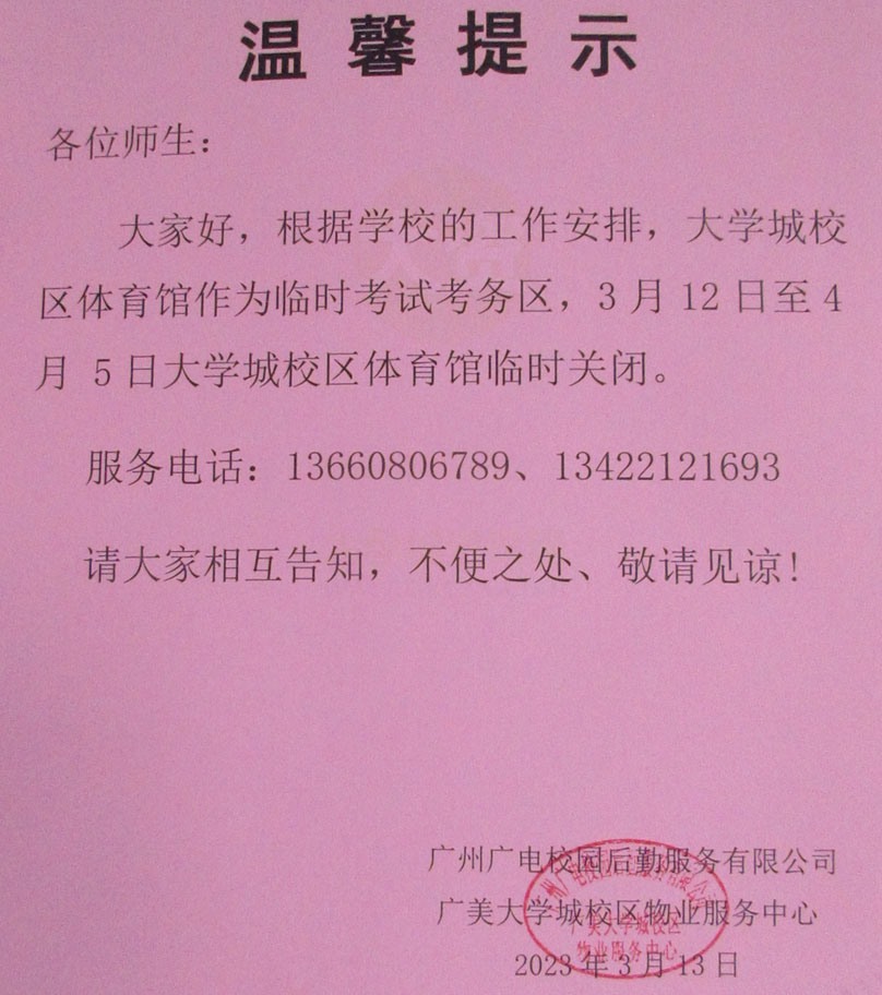 | 广美生活区体育馆说3月12日-4月5日临时作为考试考务区 就是此期间暂时不开放使用 具体分别是啥考试倒没细说 | ||||||