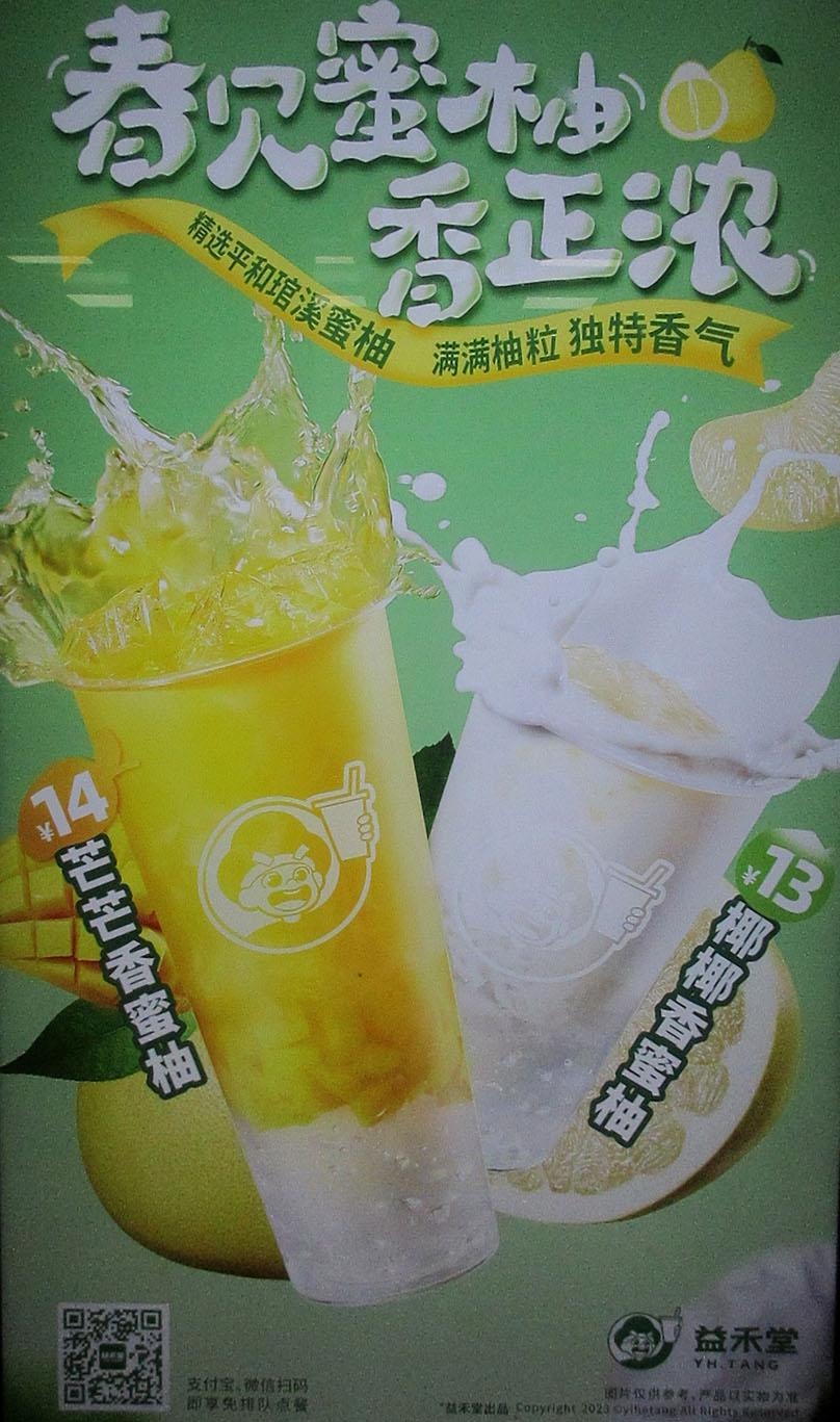 生活区1栋一楼 益禾堂 春季蜜柚系列 芒芒香蜜柚14元 椰椰香蜜柚13元