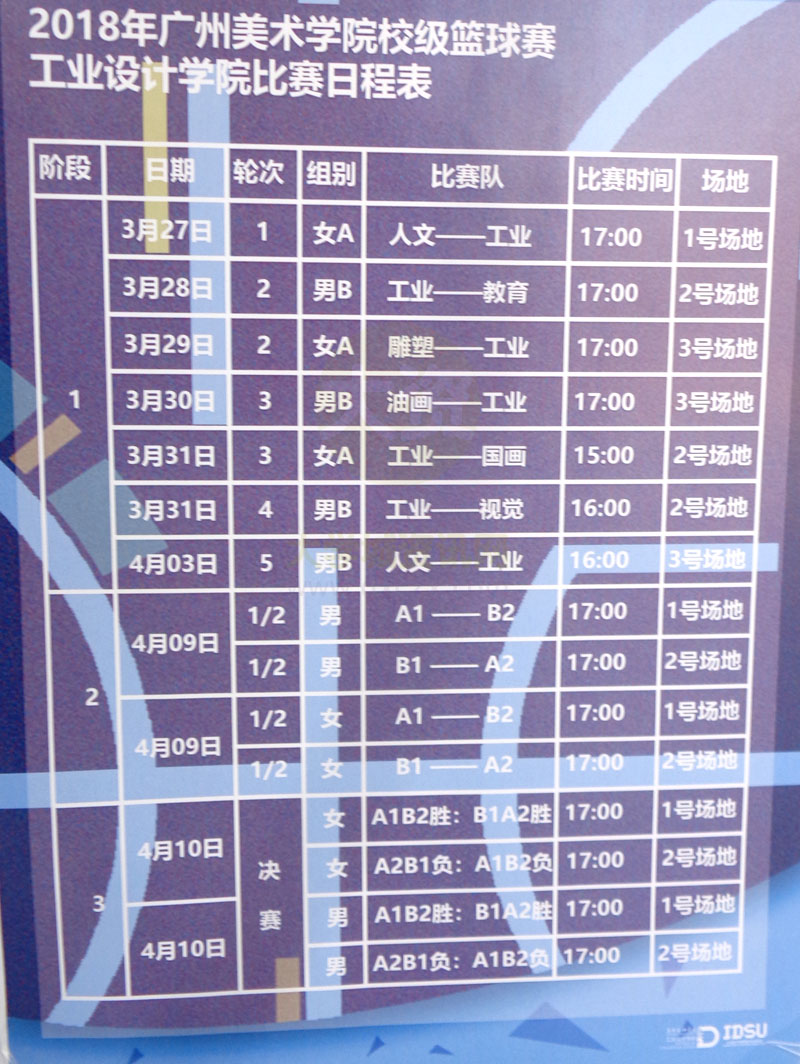 | 2018广州美术学院校级篮球赛工业设计学院赛程安排 | ||||||