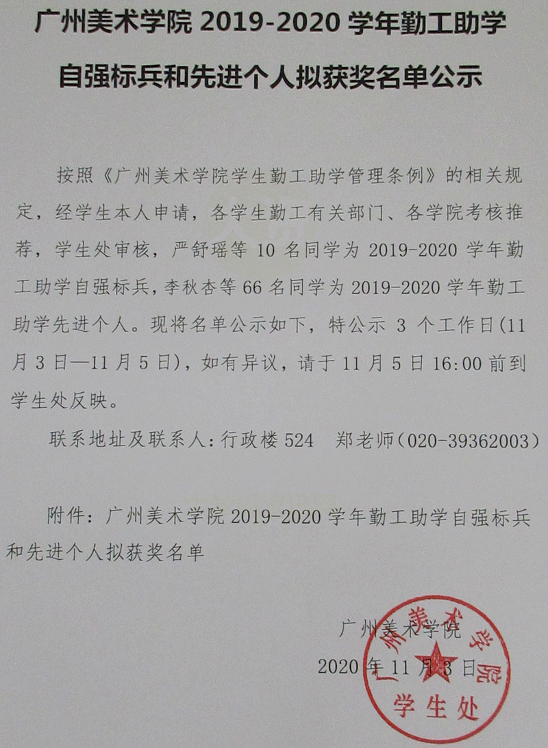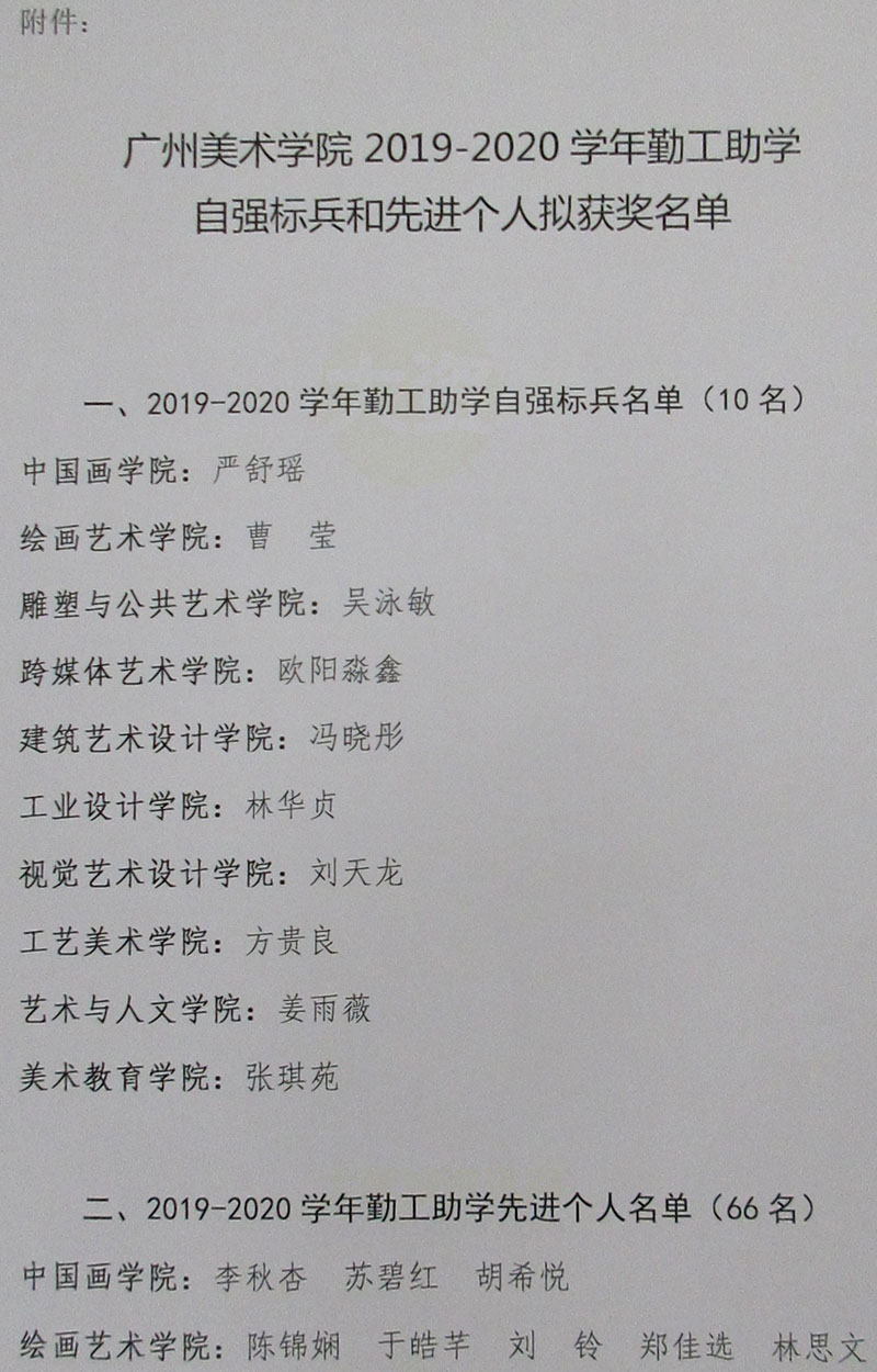 | 广州美术学院2019-2020学年勤工助学自强标兵和先进个人拟获奖名单再公示(有更新) | ||||||