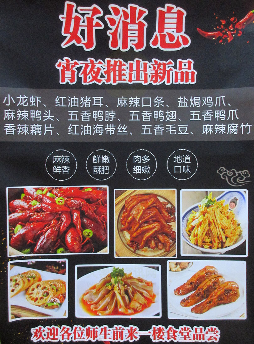 | 好消息 广美饭堂一楼宵夜推出新品 小龙虾、红油猪耳、麻辣口条、盐焗鸡爪、五香鸭脖、…… | ||||||