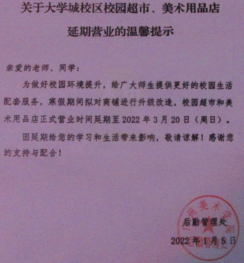 | 生活区宿舍1栋一楼的校园超市和画材用品店说寒假期间进行升级改造并延续到开学初段,重新装修好后预计是3月20号恢复营业 | ||||||
