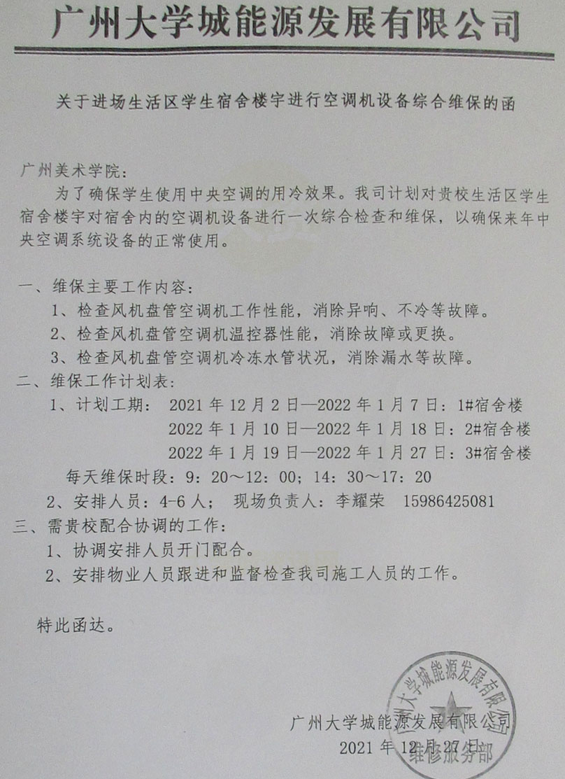 生活区宿舍楼空调机设备综合维修保养通知公告 |