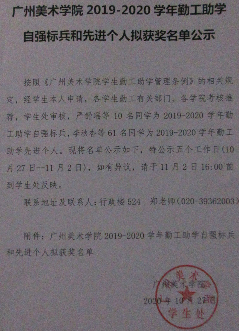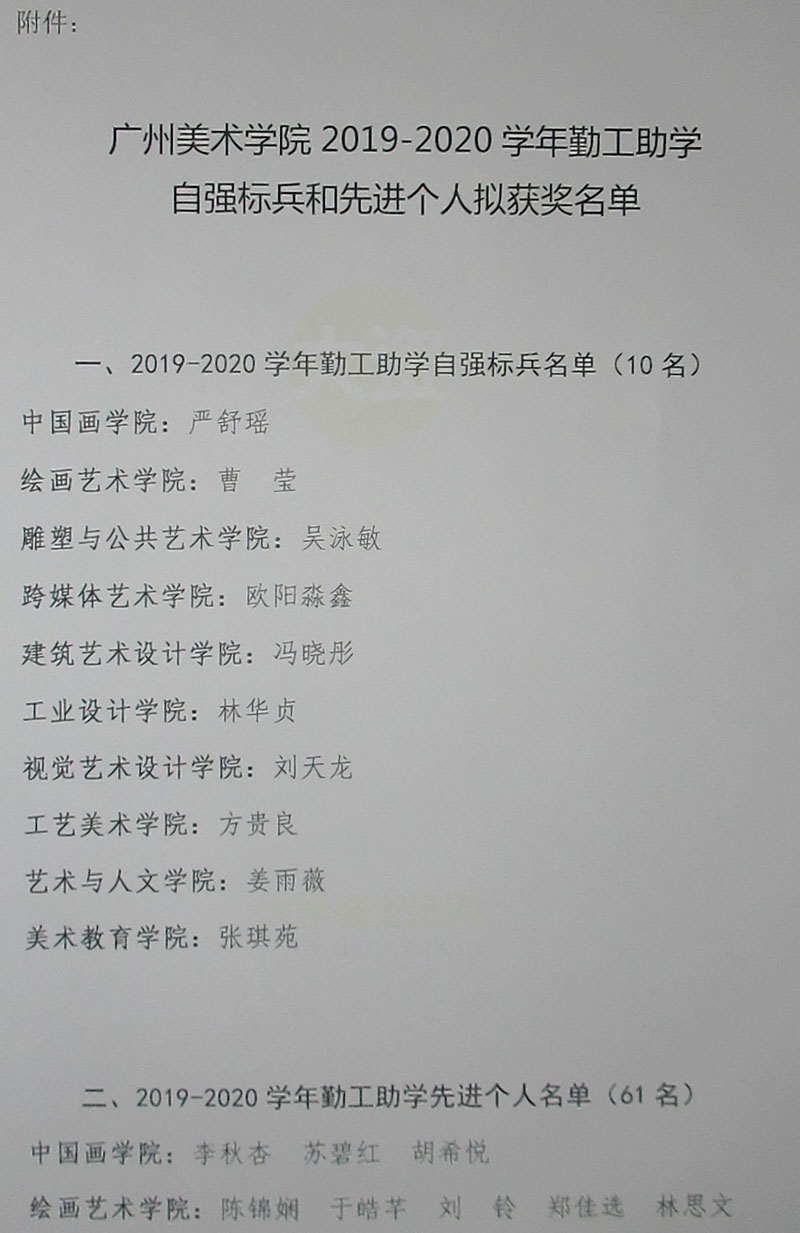 | 广州美术学院2019-2020学年勤工助学自强标兵和先进个人拟获奖名单公示 | ||||||
