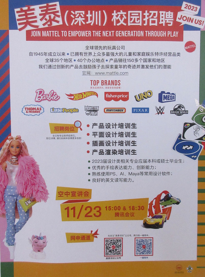 美泰(深圳)2023校园招聘 空中宣讲会11.23周三下午15点-18点30 线上参与 招聘岗位:平面&插画&产品设计培训生,产品渲染培训生