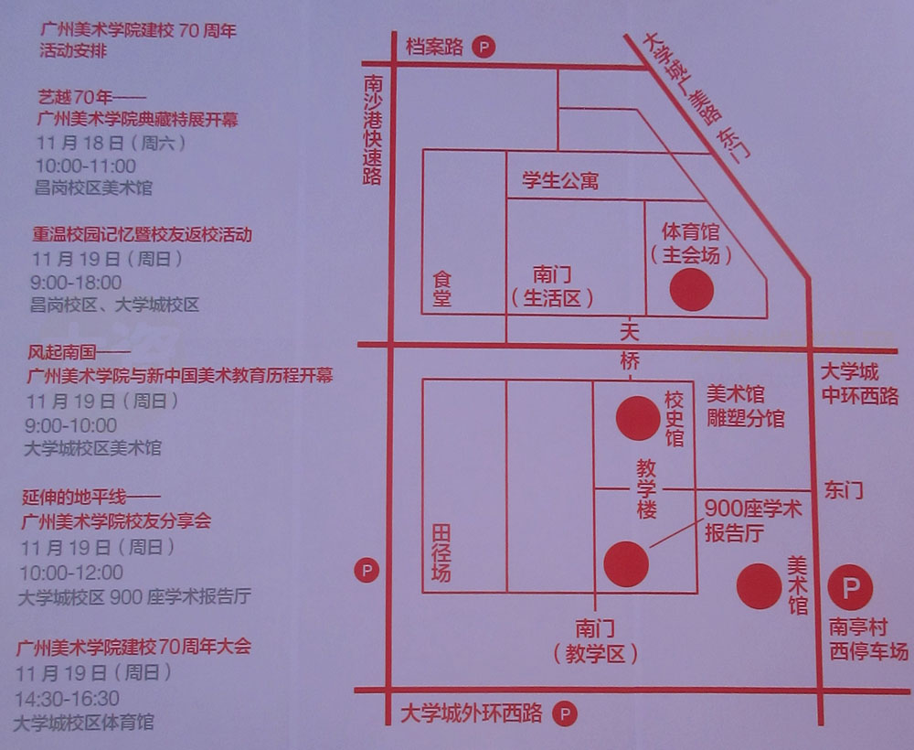 广州美术学院建校70周年活动安排 校友返校11.19周日 9:00-18:00 新中国美术教育历程11.19 9:00-10:00美术馆