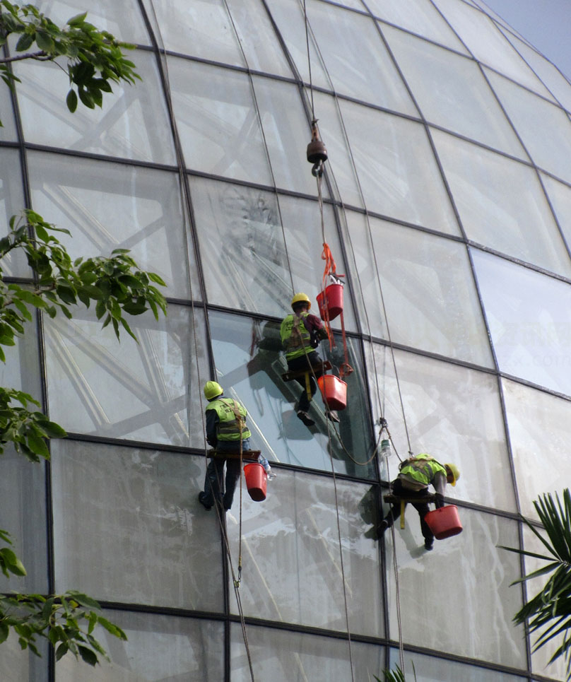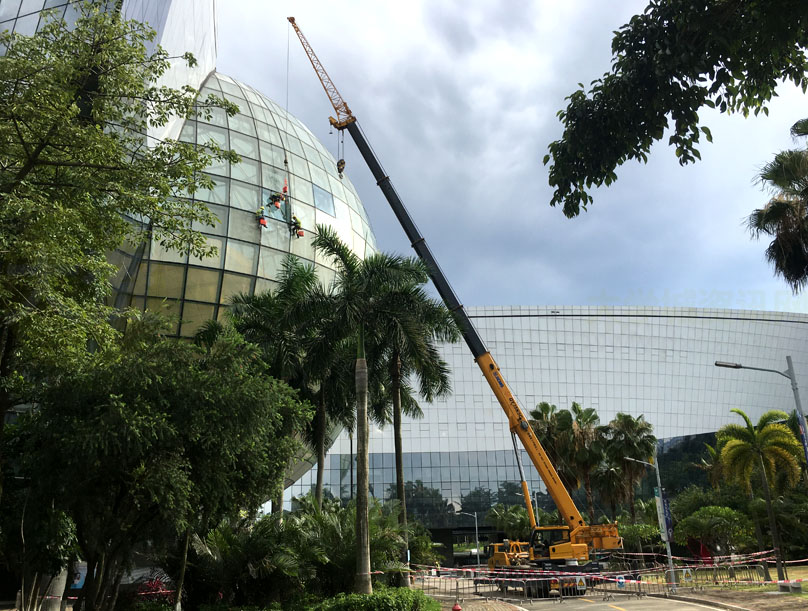 科学中心西北门外道正进行对圆球空间(球幕影院)一些老化损旧的玻璃外墙进行更换作业