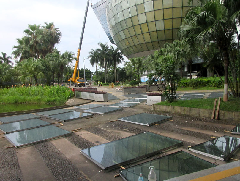 | 科学中心西北门外道正进行对圆球空间(球幕影院)一些老化损旧的玻璃外墙进行更换作业 | ||||||