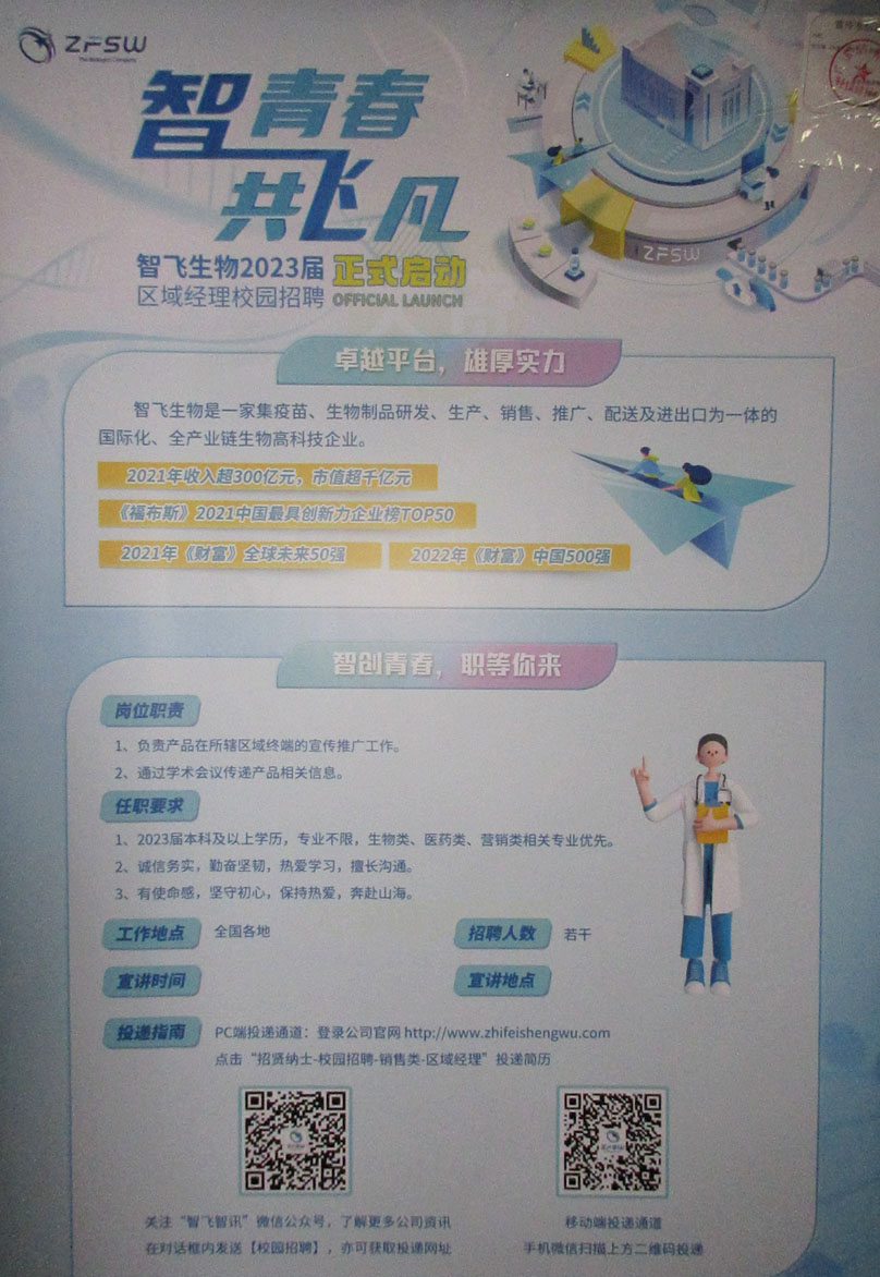 智飞生物2023届区域经理校园招聘正式启动 宣讲会时间10月12日傍晚18点30分-21点30分 教学区A2-324 |