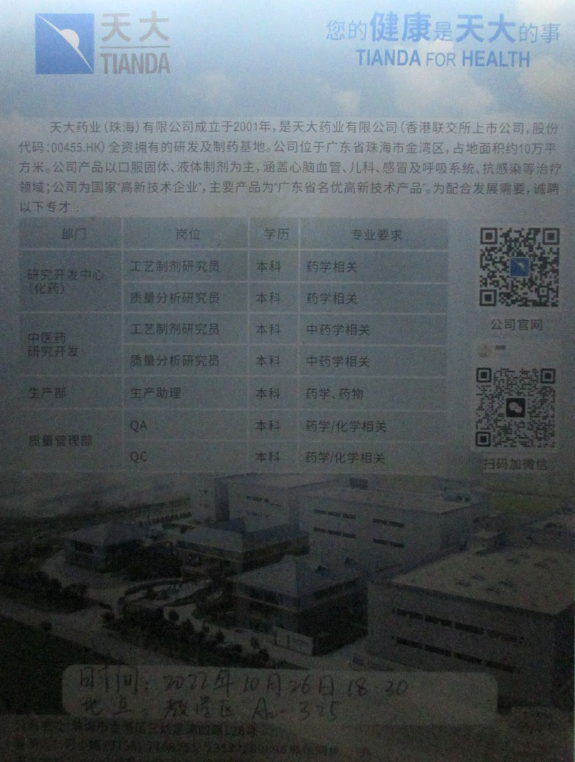 | 天大药业2023届校园招聘 2022.10.26周三傍晚18点30 教学区A2-325 | ||||||