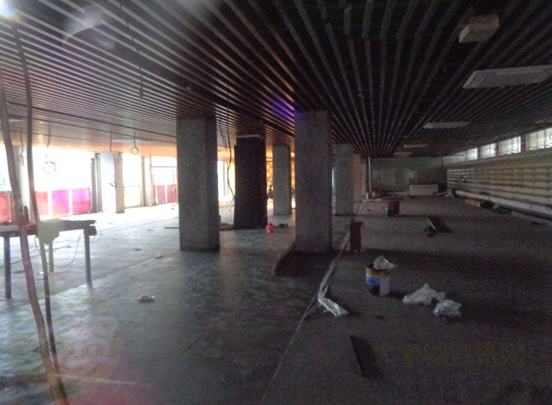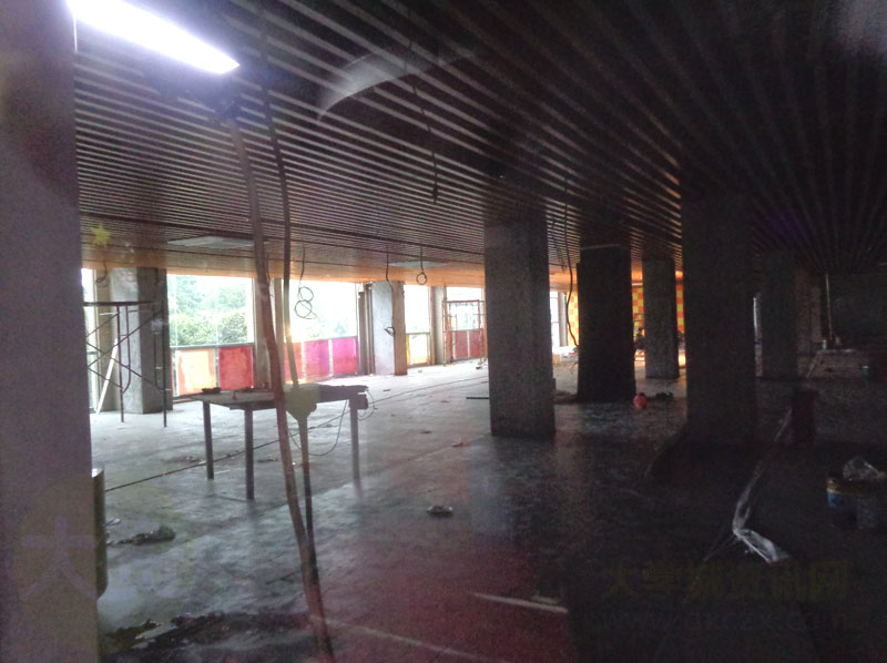 内部空间原大学新厨的餐桌椅具都已经清走,目前在进行超市格局的内部装修