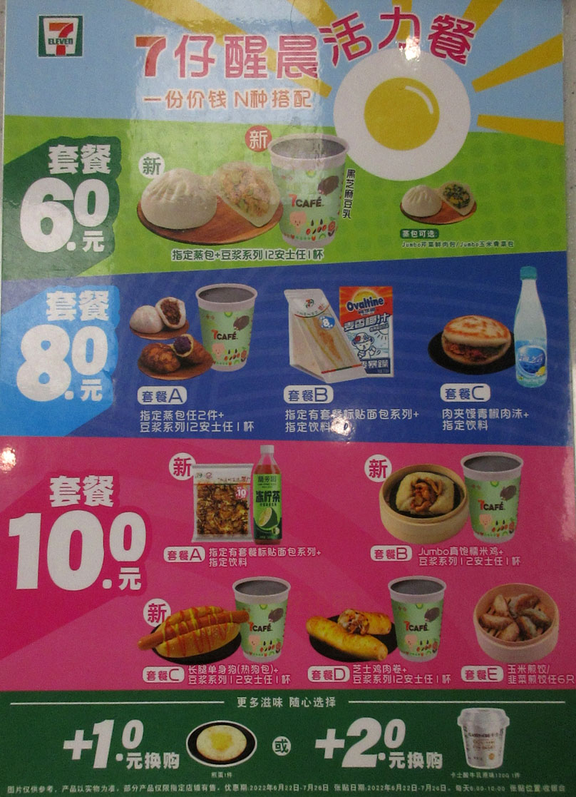| 广大商中A区西门天桥下 711便利店 7仔醒晨活力餐 一份价钱 N种搭配 分别有6元、8元、10元套餐 各有二、三、四种搭配 | ||||||