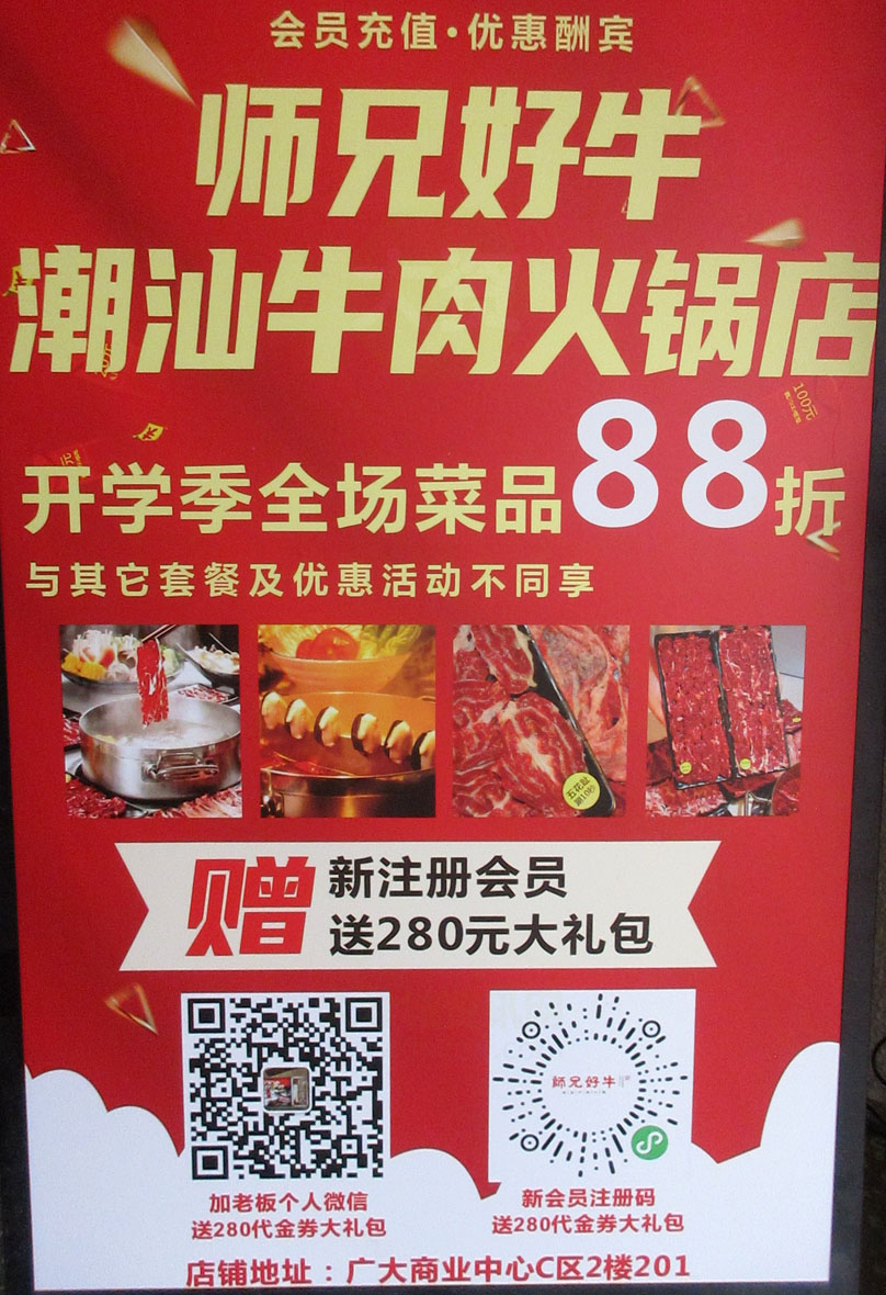 | 广大商中C区二楼东南角楼梯上 师兄好牛·潮汕牛肉火锅店 开学季全场菜品8.8折 新注册会员赠送280元大礼包 | ||||||