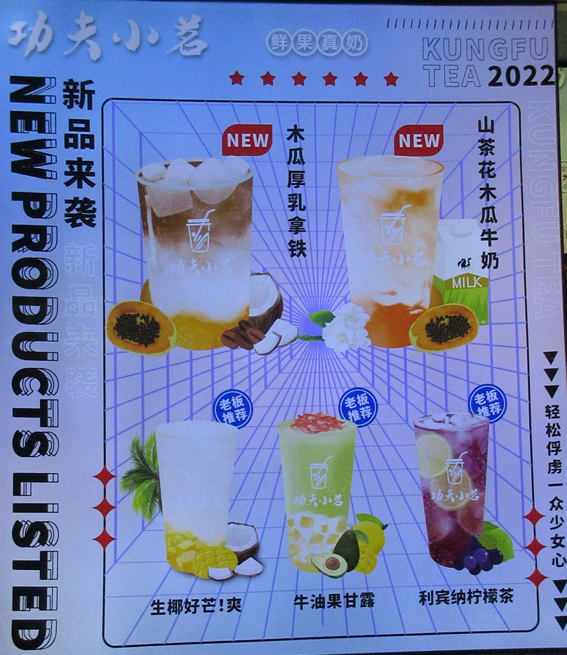 广大商中C区一楼美食中心内 正门进东侧直见 功夫小茗 新品来袭-木瓜厚乳拿铁,山茶花木瓜牛奶,生椰好忙!爽,牛油果甘露,利宾纳柠檬茶
