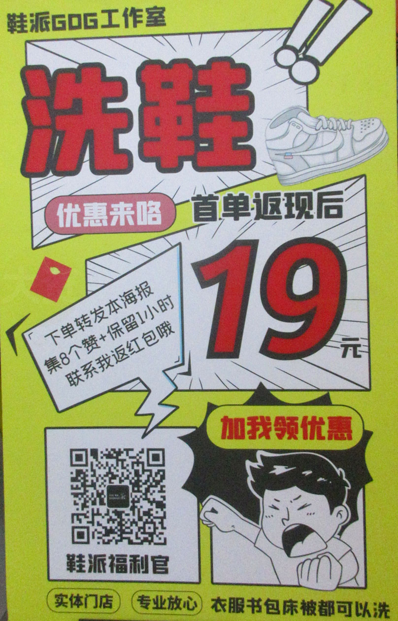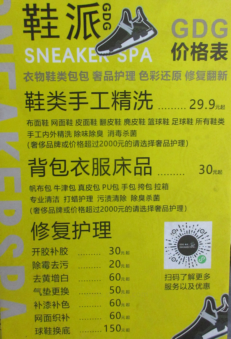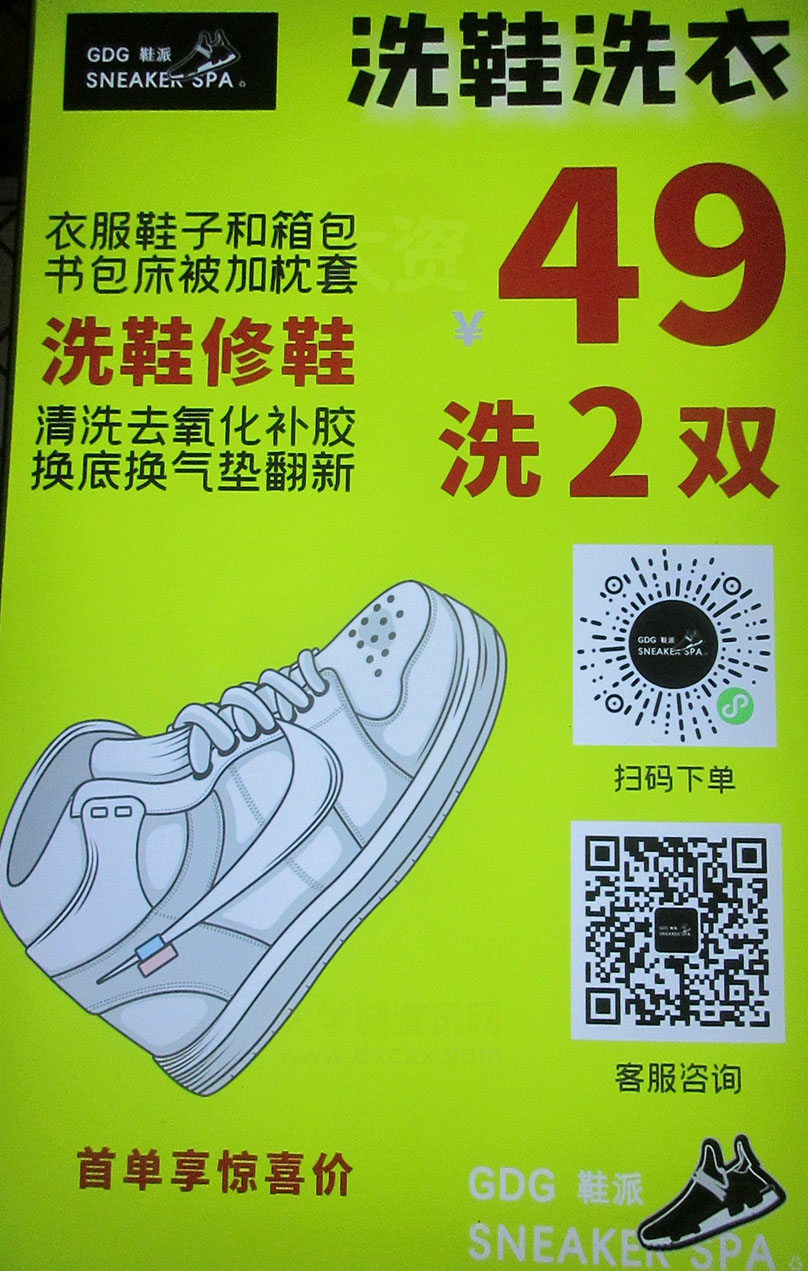 | 广大商中D区西廊道中&转角处 GDG鞋派-洗鞋洗衣店 洗2双49元 首单返现后19元 附各类洗护修复详细价格表 | ||||||