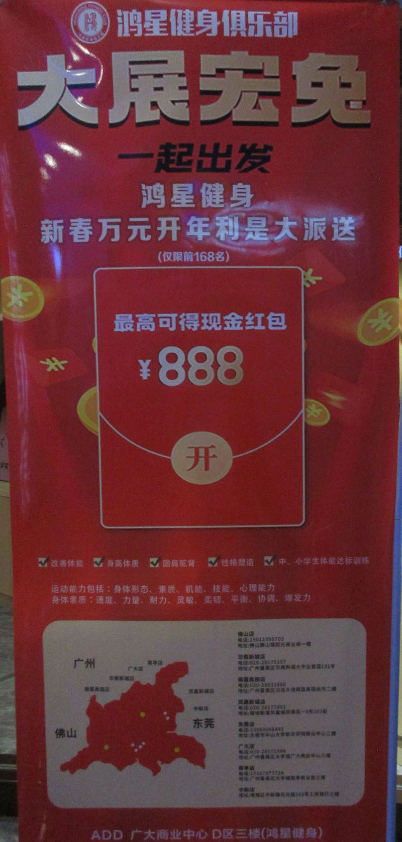 | 广大商中D区东北角楼梯&电梯上三楼 鸿星健身俱乐部 新春万元开年利是大派送 最高可得现金888元 仅限前168名 扫码咨询 | ||||||