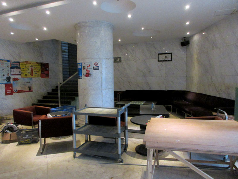 之前就有说,建议KTV的出入口改到这边两个角楼梯的其中之一个,考虑到那边北侧原先的正门大厅,对出就是教师公寓的建设工地,一来是狭窄,二来是给一些想来唱歌的人,感觉不是那么方便或舒服感,情绪上多少有点逆感,今天看到果然,已经在C区东南角楼梯开了一个入口,并且下边也有提示牌,上去看了下,感觉也是挺妥,就是没有那边的垂直电梯那么快捷直上,两三天前听说准备装修那个正门入口大厅,就是原先的订房咨询前台空间