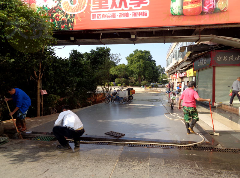 | 清洁工正在清洗C区西侧刚拆不久位置的下水道和地板 | ||||||