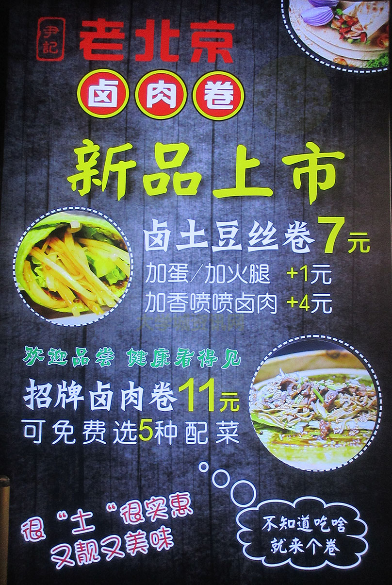 广大商中A区西侧外列 KFC和711之间 老北京卤肉卷 新品上市 卤土豆丝卷7元 加蛋&加火腿+1元 加香喷喷卤肉+4元 招牌卤肉卷11元 可选5种配菜
