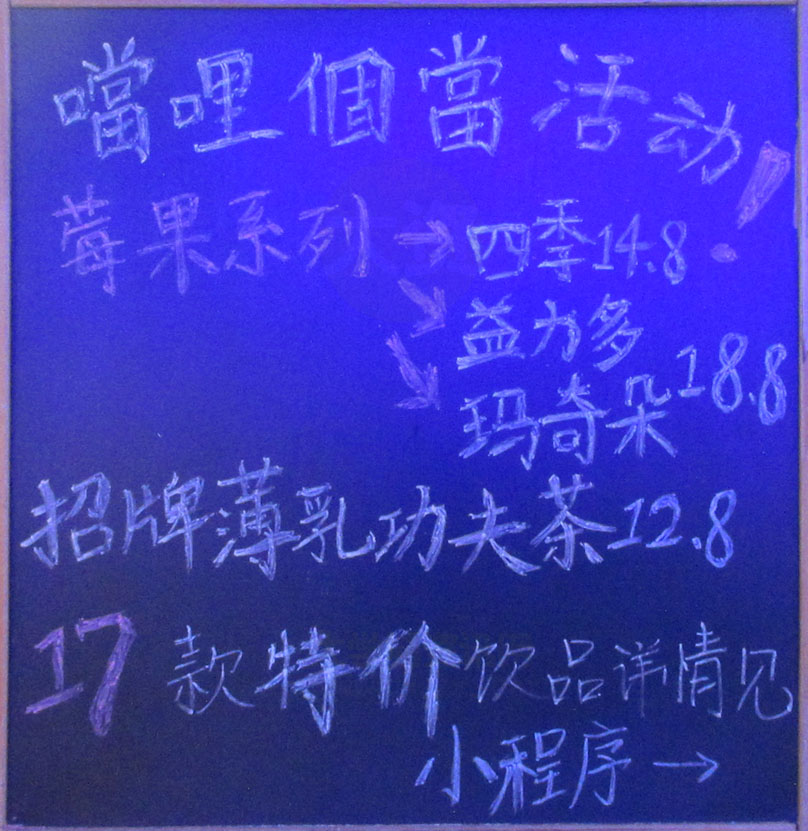 | 广大商中A区酒店大堂东南廊道 噹哩個當活动 莓果系列-四季14.8元,益力多&玛奇朵18.8元 招牌薄乳功夫茶12.8元 17款特价饮品详见小程序 | ||||||