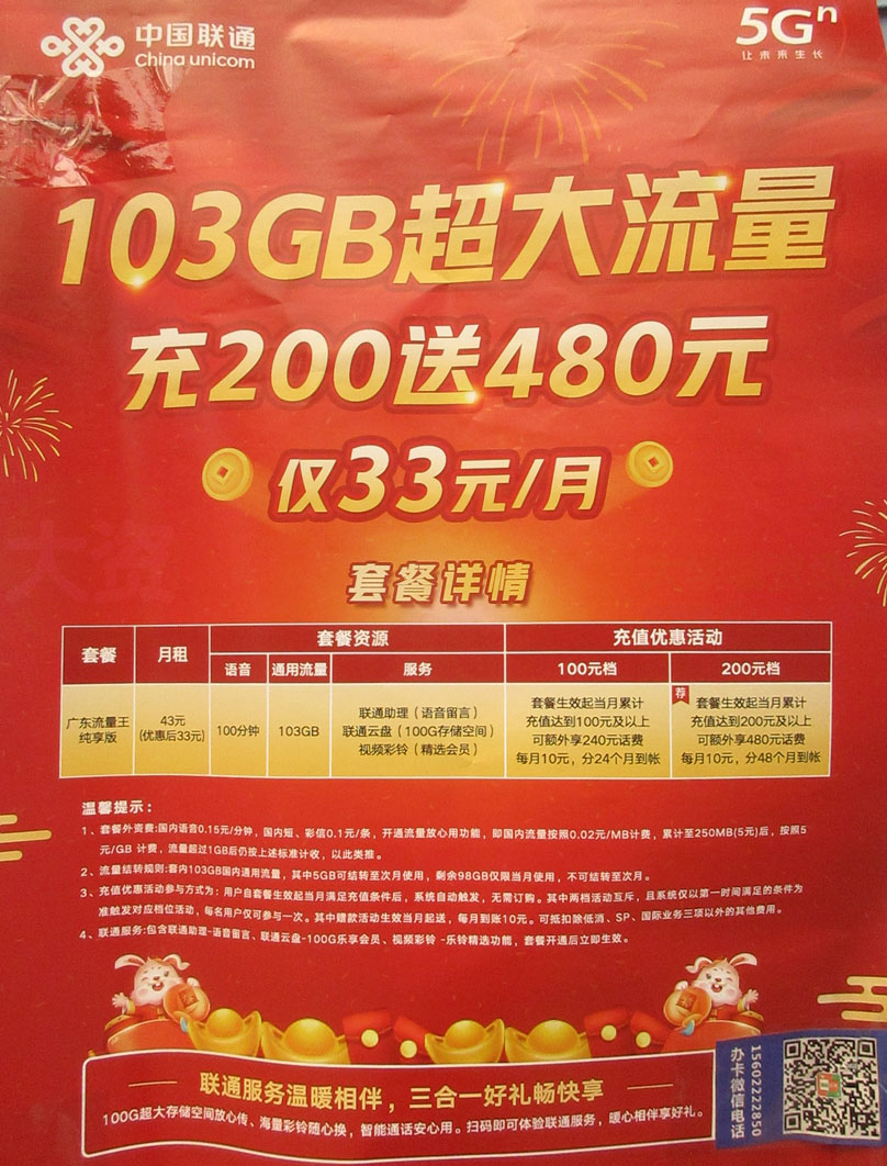 | 商中中庭广场 联通流量套餐推广摊位 校园卡领取处 100G超大流量 充200送480元 仅33元每月 | ||||||