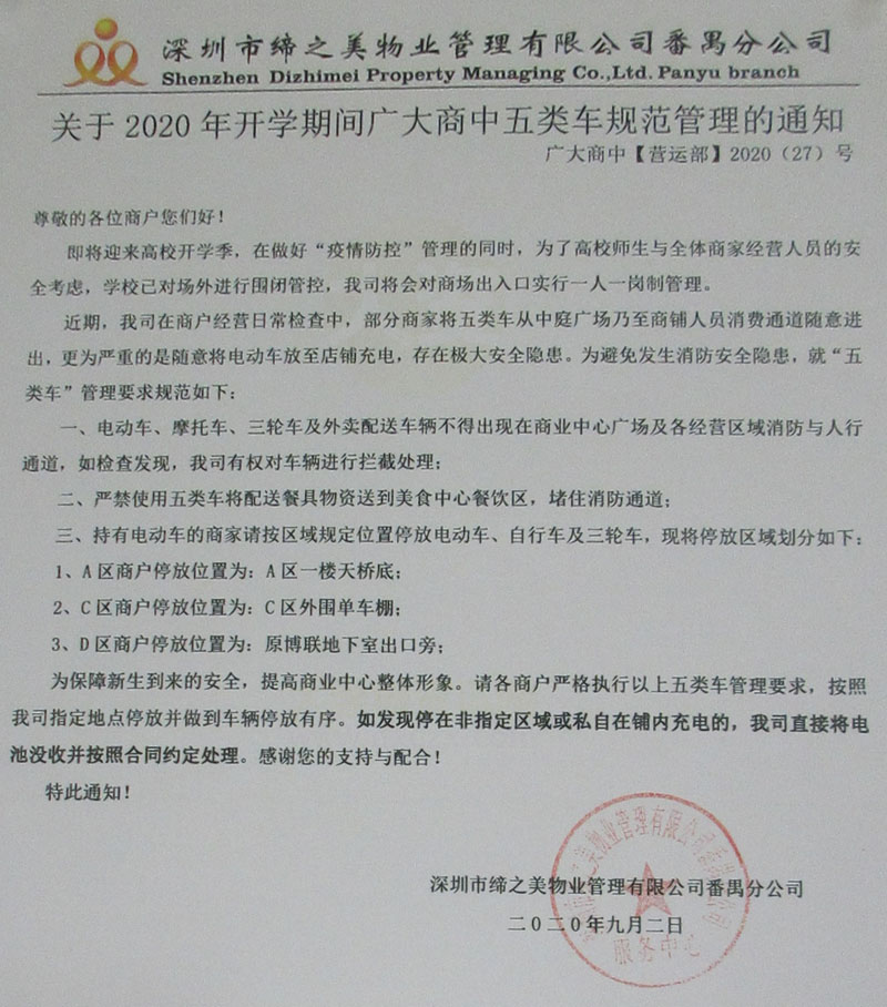 | 关于2020年开学期间广大商中五类车规范管理的通知 缔之美物业2020.09.02 | ||||||