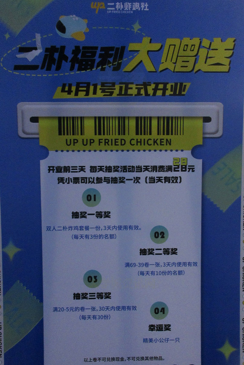 广大商中A区内中横座西北-二朴炸鸡社4月1号才正式开业喔 开业前三天消费满28元即可参与抽奖 奖品有套餐和满减券