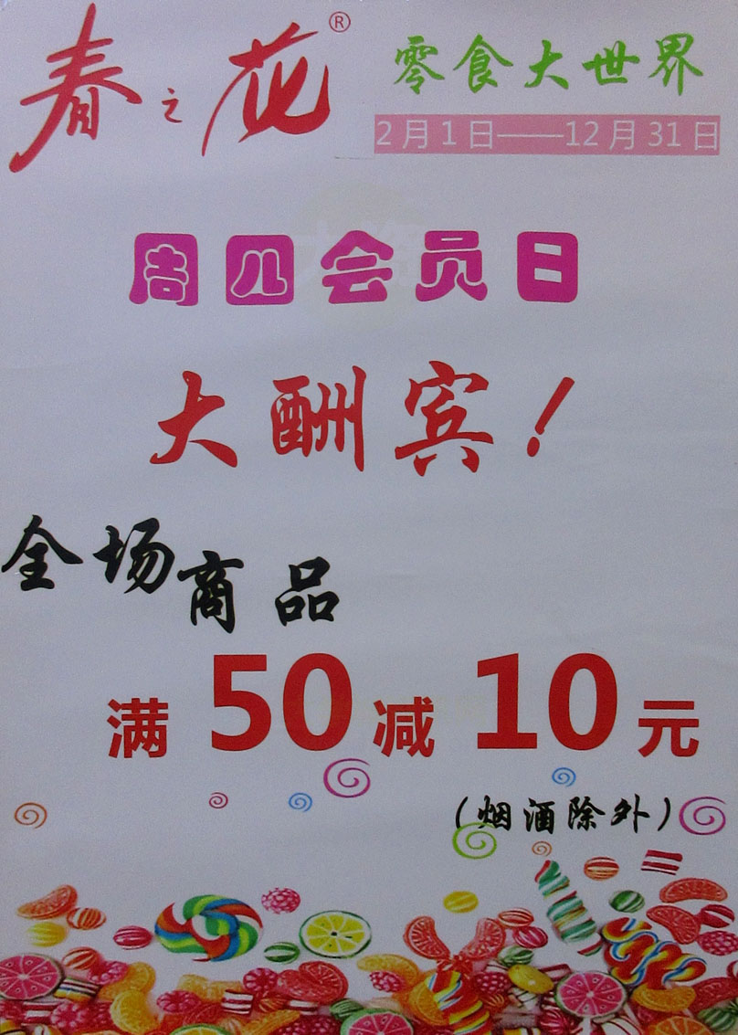 | 广大商中D区内西廊道南-春之花零食大世界 周四会员日 全场商品满50减10元 2022年全年 | ||||||