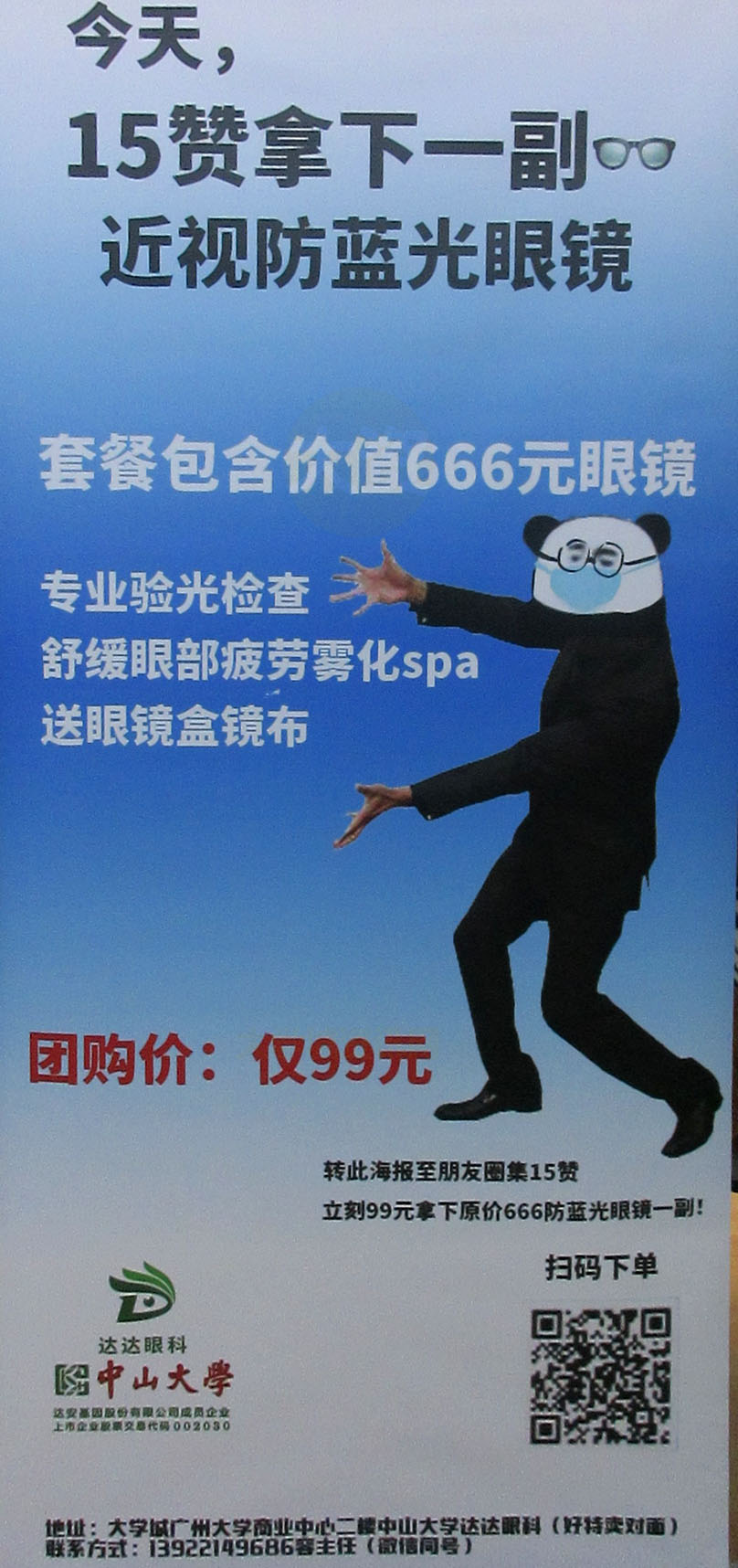 商中D区二楼西直廊道中南-达达眼科&66眼镜 转发海报朋友圈集15赞即可99元买原价666元防蓝光眼镜一副
