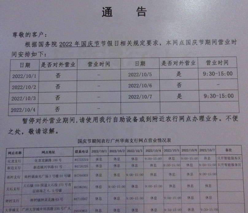 广大商中A区酒店大堂二楼 农行大学城营业厅 国庆期间放假营业安排 10.1,2,3,4,6五天放假,10.5,7两天对外营业,具体是上午9点半到下午3点